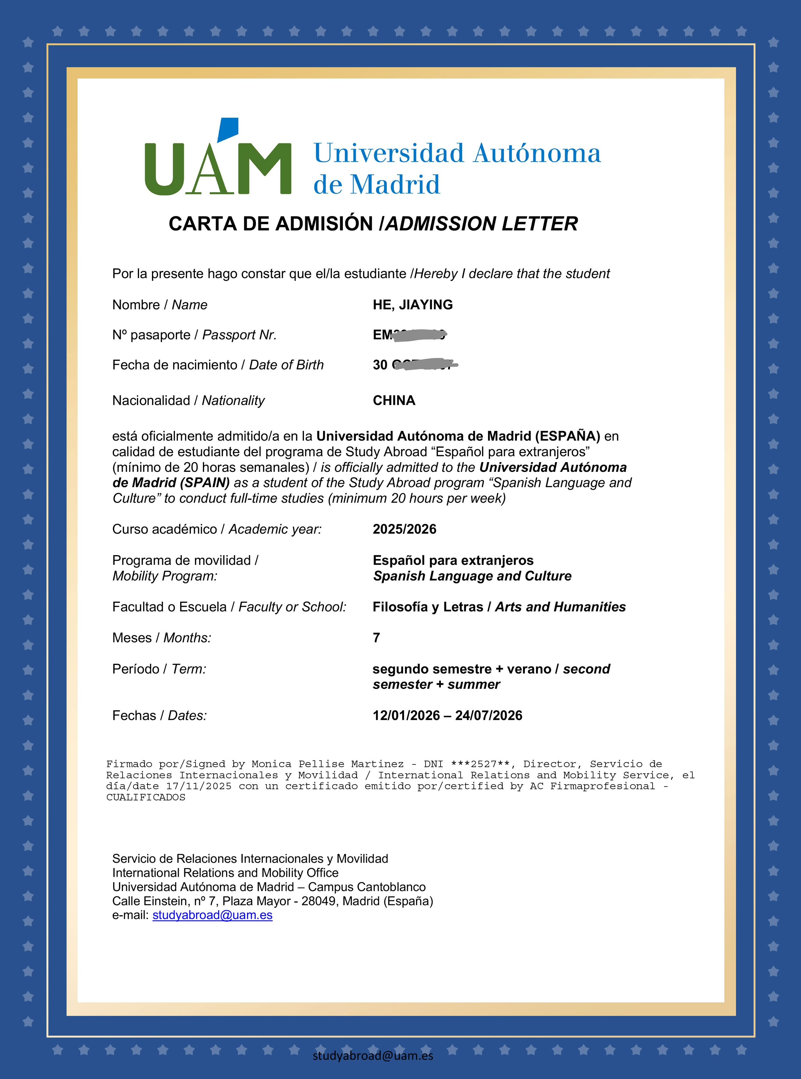 图1:左图为23级同学所获马德里康普顿斯大学预录取通知书;右图为23级同学所获马德里自治大学预录取通知书